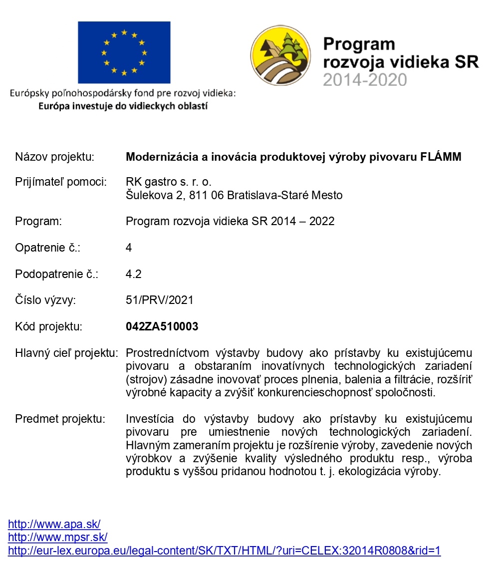 Cieľom projektu realizovaného od decembra 2018 do februára 2019 bolo zvýšiť konkurencieschopnosť spoločnosti RK gastro s.r.o. deiverzifikáciou činností spoločnosti o varenie piva v minipivovare v Rajeckých Tepliciach.