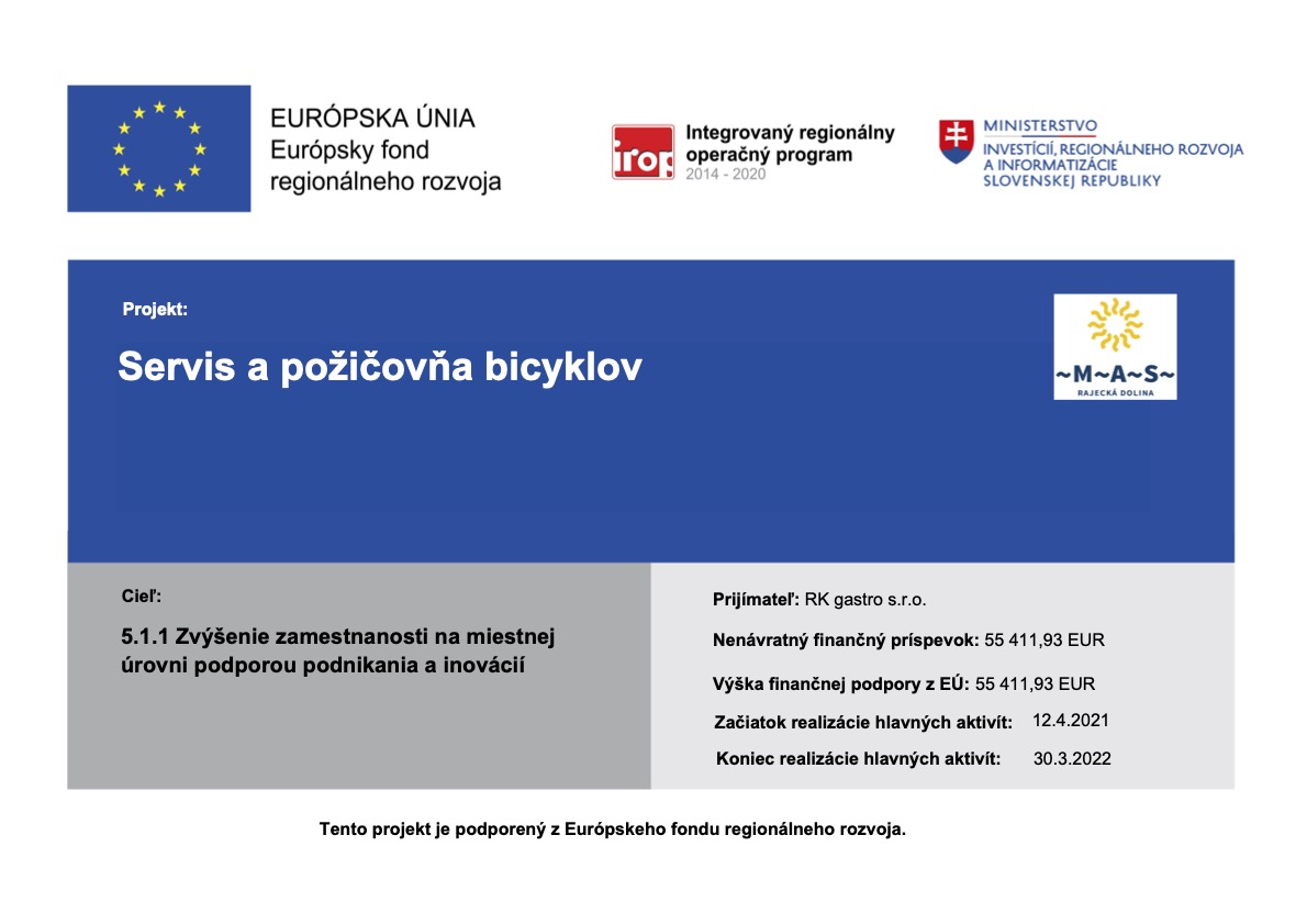 Cieľom projektu bolo obstaranie výstavby požičovne bicyklov, 15 elektrobicyklov, vybavenia pre cykloservis, rezervačného systému na správu rezevácií, reklamy a marketingu projektu. Splnili sme merateľné ukazovatele a vytvorili 1 pracovné miesto.